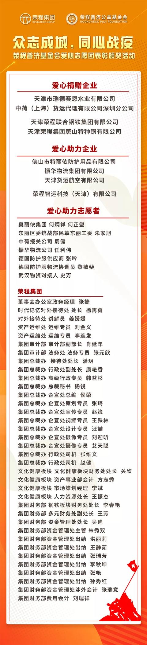 会上,刘潇蔚秘书长宣读爱心企业表彰名单;傅林副秘书长宣读荣程爱心志愿团表彰名单。全体人员还观看了荣程抗疫回顾视频。