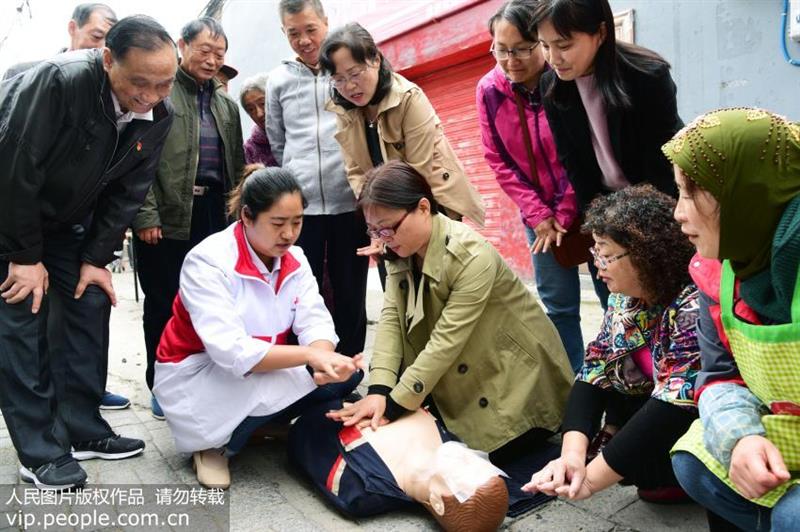2018年10月25日,在江苏省镇江市,志愿者在指导居民学习心肺复苏技能。
