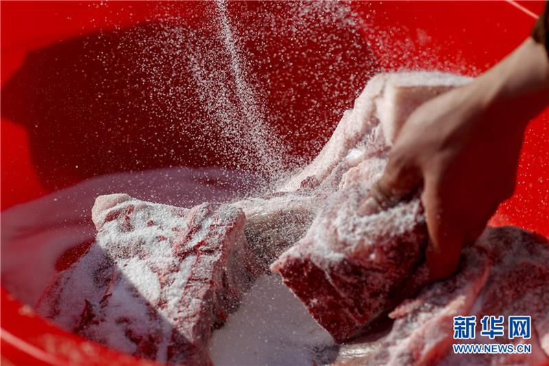 1月19日,在黄山市徽州区西溪南镇,村民正在腌制腊味。