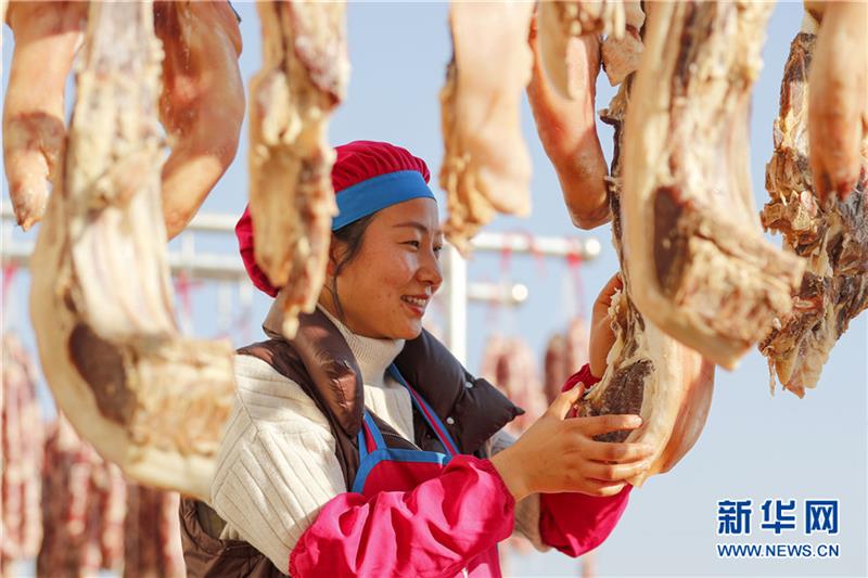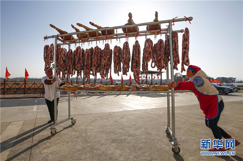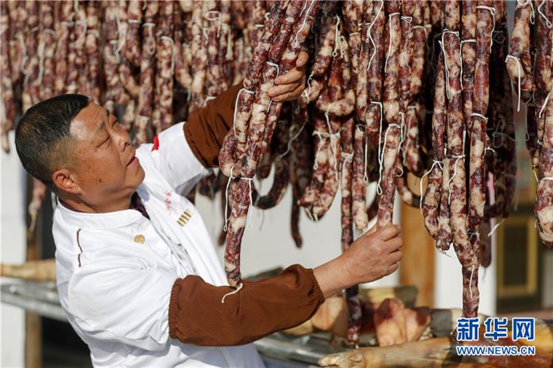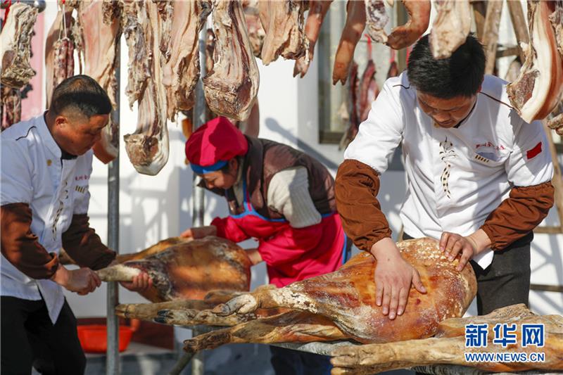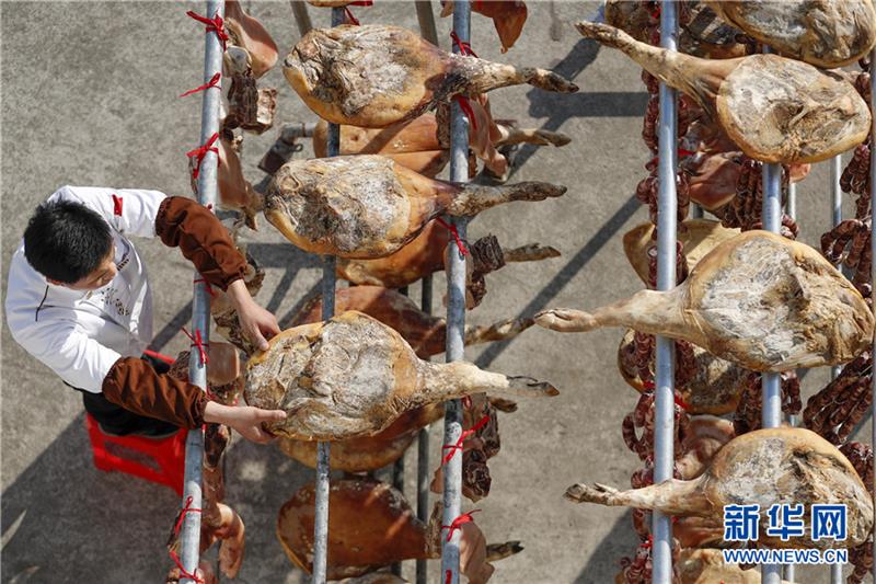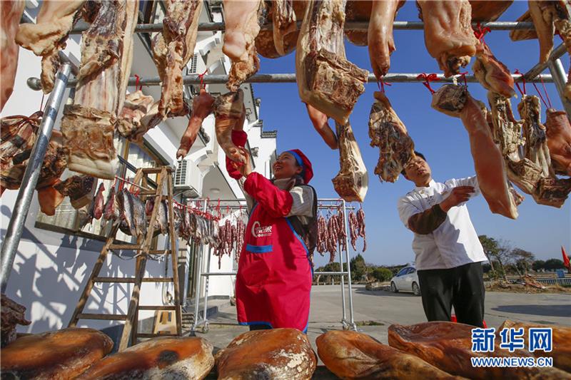 随着春节临近,安徽省黄山市徽州区西溪南镇村民开始制作徽州传统腊味,腌制火腿、腊肉,灌制香肠,并进行晾晒。腊味飘香,年味渐浓,制作、晾晒传统腊味成为徽州一道独特风景。新华网发(施亚磊 摄)