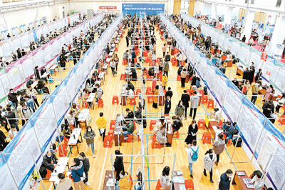 江苏淮阴师范学院学生在招聘会上挑选岗位。 |