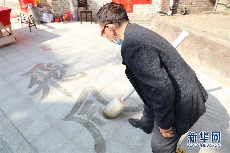 张达文认为用毛笔写大字挥春,是一种喜庆和年味。平日里,他也会到公园,用自制的“毛笔”写大字。新华网 陈雪莹/文 林晓蕾/摄