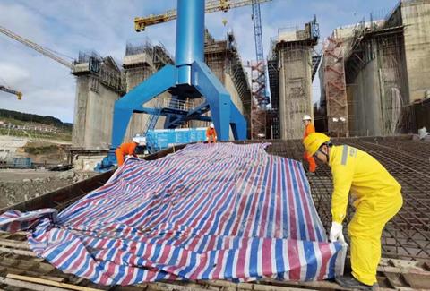 施工人员铺盖防雨布确保待验仓面整洁。(工程方供图)