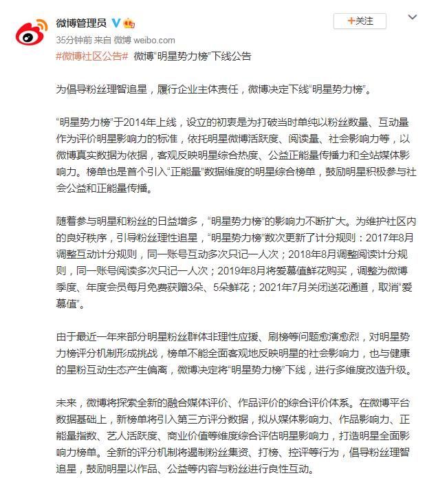 为倡导粉丝理智追星 微博决定下线“明星势力榜”