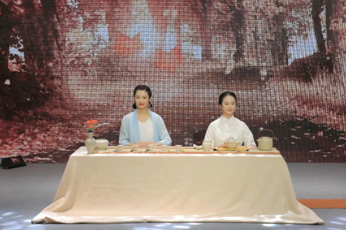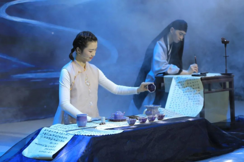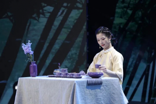 一席靛蓝茶席,一套紫色钧瓷茶器,撞色设计搭配与茶席相融相契,整个表演现场穿越了回忆进入最忘情忘境的世界。