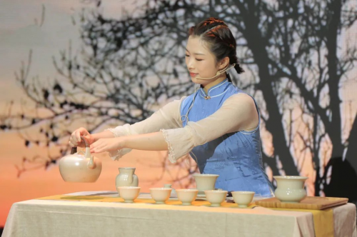 半决赛“茶中诗意长”环节,整茶席大胆创新,把茶艺戏剧化,用色彩鲜艳的【问鼎钧瓷】搭配故事《牡丹亭》的舞台。