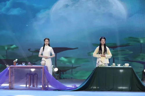 周曦凡、常艺选择夜静春山的主题,最终周曦凡以醇厚的茶汤,一方紫色茶席获得了首个进入国茶天团的名额。