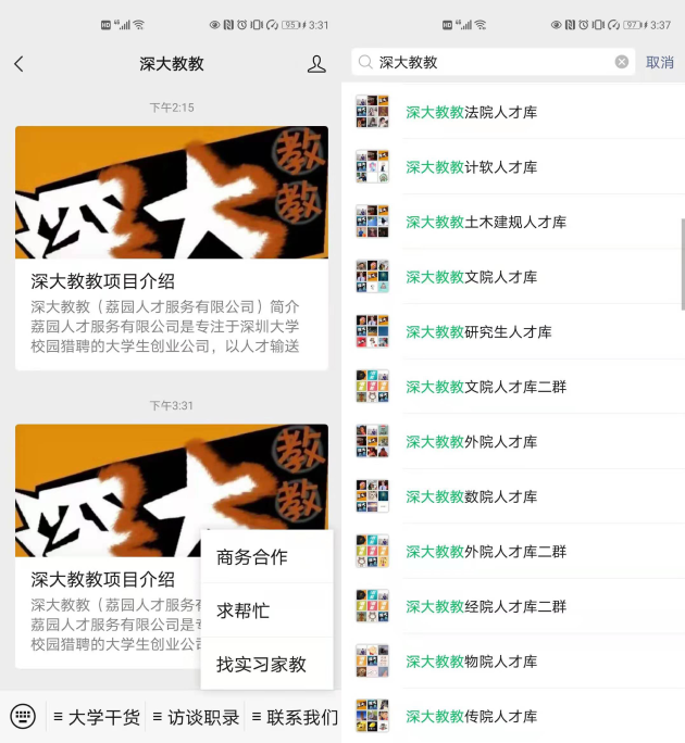 深大教教作为深圳大学校园的影响力自媒体平台,校园内部铺成了各个学院各个系每个学专业的垂直点到点的网络结构,平台覆盖面积广,基于本身产生于深圳大学,所有也有许多外面企业不具备的深圳大学人才资源,能追踪定位到每一个学子,目前覆盖了全校35000+名校园学子。