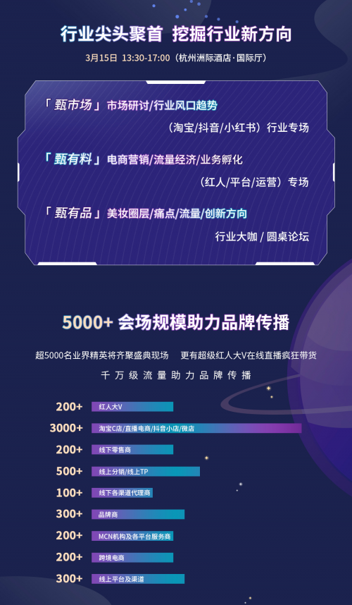 展览涵盖了行业会议分享、红人集会、会议品牌曝光、线下云展会巡展、新品发布会、晚宴颁奖。其中“飞跃甄程,蓄势共进”星级资源品牌合作洽谈会,作为独家板块汇聚社群机构、电商平台、直播机构、MCN机构、小程序、公众号,实现了渠道资源无缝对接,品牌需求一步到位。