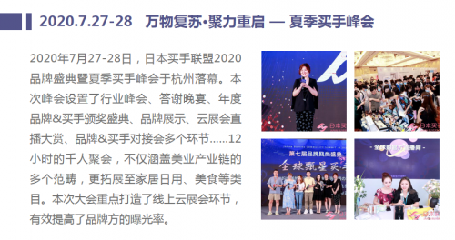 其中日本买手联盟作为跨境平台,一直紧跟时代潮流,第九届品牌风尚盛典通过直播(线上)+品牌展会(线下)二合一的形式,邀请明星助阵,联合直播,助力品牌。高效连接品牌与买手的供需需求,精准品牌曝光、即时销售转化拓宽长远的商业合作空间,从“网红-选品-直播-带货-爆品”全流程,为企业打造超级美妆爆品!