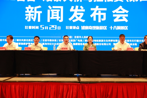5月13日上午,2021酒鬼酒·吉首矮寨大桥马拉松赛新闻发布会在湘西州皇冠假日酒店三楼宴会厅召开。市委常委、市委宣传部部长向洪琼、酒鬼酒股份有限公司党委副书记、纪委书记、副总经理滕建新、市人民政府副市长彭小明、德夯风景名胜区管理处主任王文军、花垣县委宣传部副部长麻静荣、市教体局副局长文茗一、市天行健文化旅游投资开发有限责任公司董事长谷明、厦门赢海世纪文化创意有限公司总经理袁石以及赛事组委会各职能单位代表共同出席了新闻发布会。