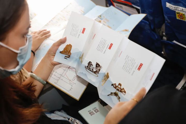 走进客舱,行李舱、迎宾壁板的装饰将大家带入天与云的翱翔中,一场红色文化旅行的飞行开始了。热情好客的山东不仅展现了自己丰富的红色文化旅游资源,还为在座的每一位旅客们准备了具有山东文化旅游特色的伴手礼,这份伴手礼中含有一份来自山东省文化和旅游厅的“山东有礼”系列文创产品——齐鲁“六好”文化旅游书签,让山东文化陪伴每一次阅读时光,好景、好趣、好味、好理、好品、好声,“好客山东”不负期待。