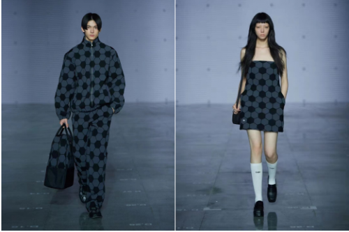 为了进一步呈现「二进制」的理念,Kappa的秀场布置赛博未来感十足。秀场空间由三面环幕围合,伴随着电子音乐紧凑的能量输出,模特身着新一季设计踏上 T 台,通过T台模特与三面投影联动,营造出无限循环叠加的震撼视觉效果。整场秀展示了风格各异、不断变化的60余套LOOK,爆款单品接连不断。