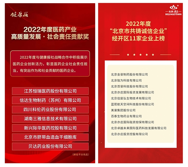 2023年3月,健康报社公布了2022年度医药产业高质量发展榜单,北京市脐血库荣膺“社会责任贡献奖”,这是对企业社会责任担当的表彰和肯定。