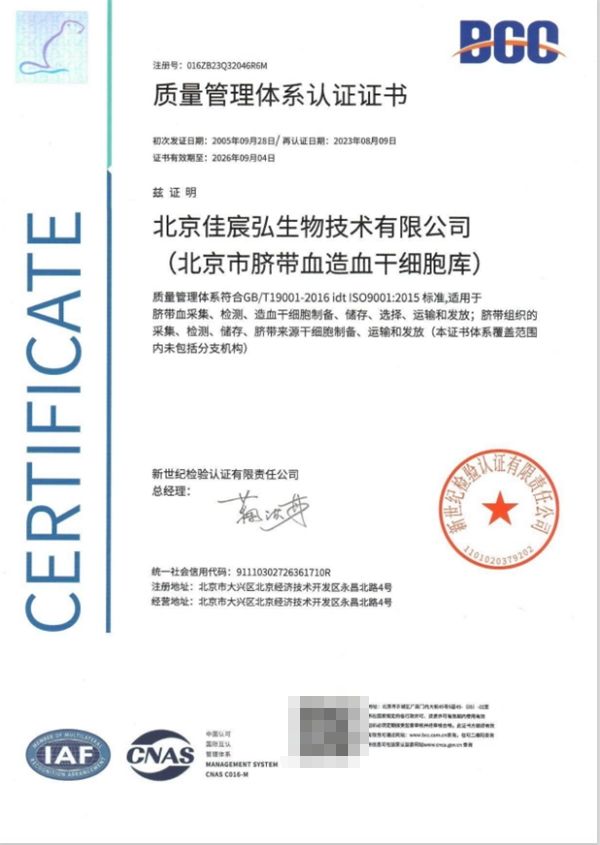 此次审核依据GB/T19001-2016 idt ISO9001:2015标准,审核范围包括脐带血采集、检测、造血干细胞制备、储存、选择、运输和发放等。评审组专家一致认为北京市脐血库质量管理体系符合准则和应用要求,质量体系运行持续有效。