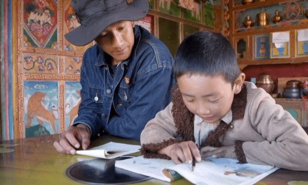 感受过大山外的世界的格勒刀吉(左一),回到家乡后希望草原的孩子们也能接受文化的熏陶