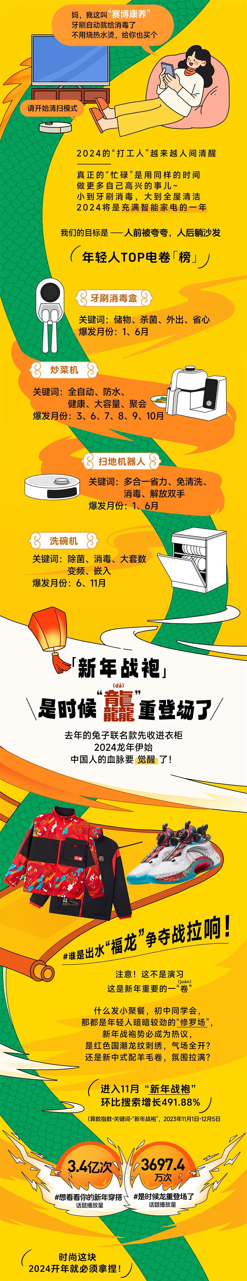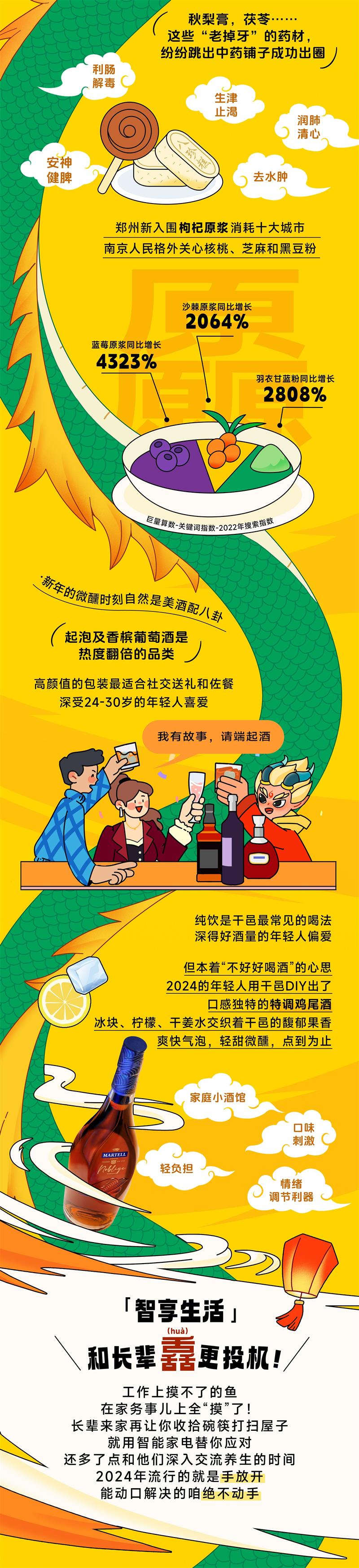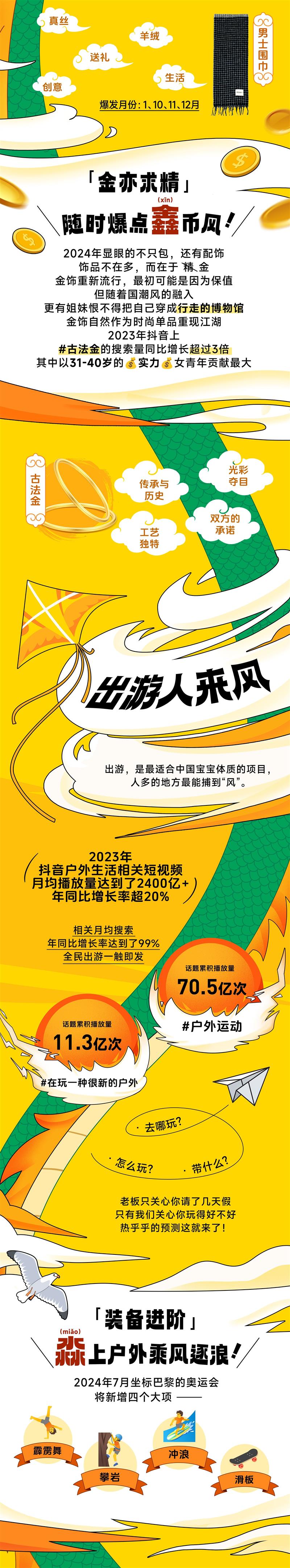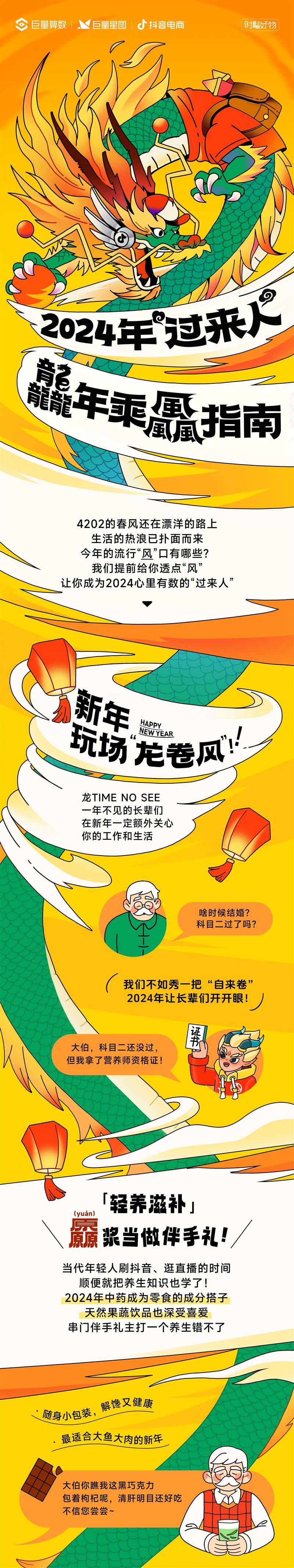 12月28日,巨量算数联合巨量星图、抖音电商共同发布《2024「过来人」龘年乘飍指南》(以下简称为“指南”)趋势预测报告,总结了与食饮、服饰、家居家电、3C数码、美妆护肤等行业息息相关的四大趋势。