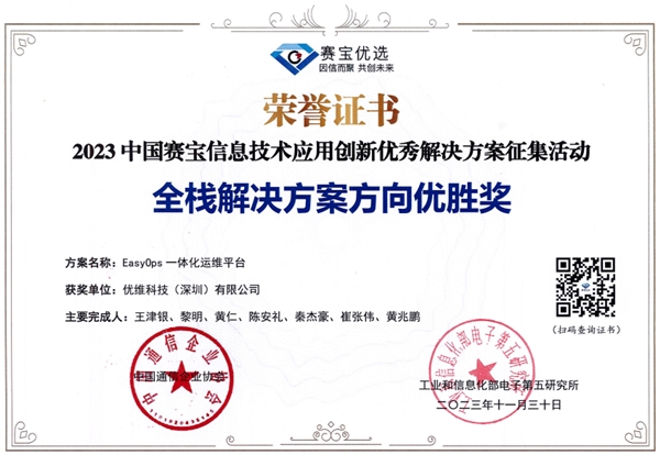 优维科技《EasyOps一体化运维平台》经历了活动报名、形式审查、初赛评审、决赛路演、结果公示等多个环节的层层考察,最终分别被评定为“全栈解决方案方向优胜奖”。