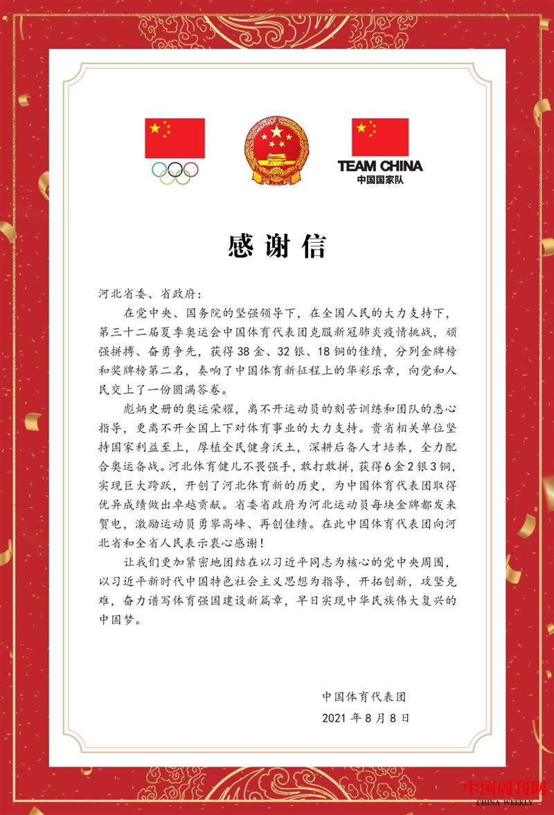 中国体育代表团给河北省委省政府发来感谢信