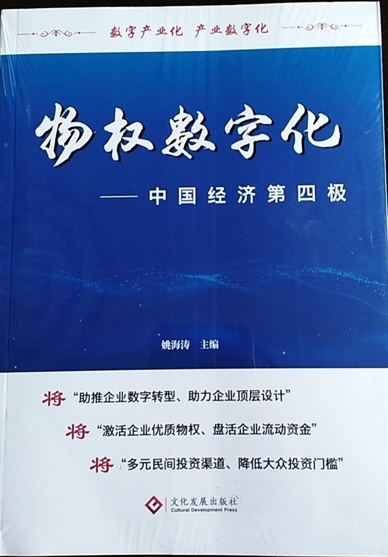 《物权数字化—中国经济第四极》由文化发展出版社出版,全国新华书店发行,由中国证券教父管金生作序、物权数字化概念创始人姚海涛先生主编、工业与信息化部华盛绿色工业基金会副秘书长郑占淮博士等联合撰写。这是中国第一部关于“物权数字化”的论述专著,该书首次提出“物权数字化”新概念、新业态、新动能学说理论,专著对激活数以万亿计物权资产的流动性,将具有划时代的非凡意义。