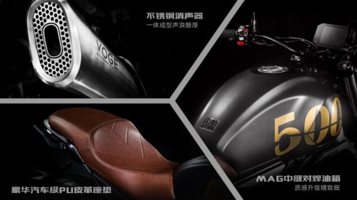 为了实现设计概念与量产状态的颜值高度契合,无极500AC各个部件应用了多重汽车级精湛工艺,例如油箱采用了MAG中缝对焊的19L,消声器采用不锈钢压铸成型,整体拉丝工艺,车架采用了高精度机器人自动焊接技术,坐垫应用了自动发泡、裁剪技术、高精度缝制技术,实现整车质感全面升级,给用户带来更极致的驾乘体验。