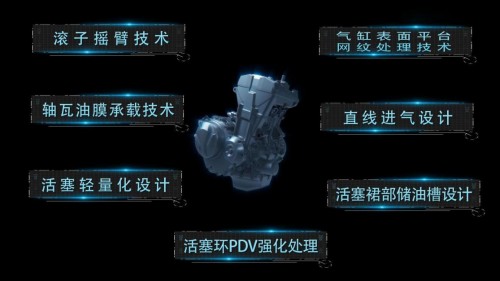 500AC的发动机在原有的技术平台上迭代升级,同时采用了无极自主开发的滑动离合器配置。发动机运动部分,采用行业先进的滚子摇臂、气缸表面平台网纹处理、轴瓦油膜承载等技术,以此降低摩擦损失,提升效率,增强耐久。