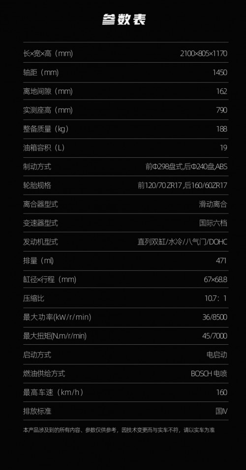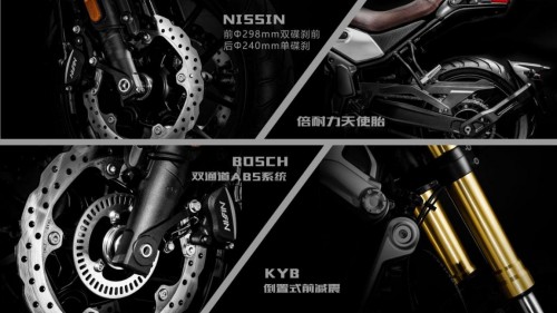 除此之外,无极500AC还集合了众多豪华配置,包括通过多路段调校的KYB倒置式前减震/后中央减震;制动效能卓越的NISSIN前Φ298mm双碟刹/后Φ240mm单碟刹;久经考验的BOSCH双通道ABS系统;刚柔并济的轻量化桁架式编织车架;科技感爆棚的全车LED灯源;抓地牢靠且耐磨的倍耐力天使胎以及智能化全彩TFT液晶仪表盘等。