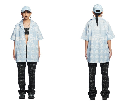 图形字母印花衬衣则将Omini 字母印花拉近放大,打造出反常规的视觉效果;衬衫上下以矩阵式排列的品牌Logo与之对比,形成强烈反差。