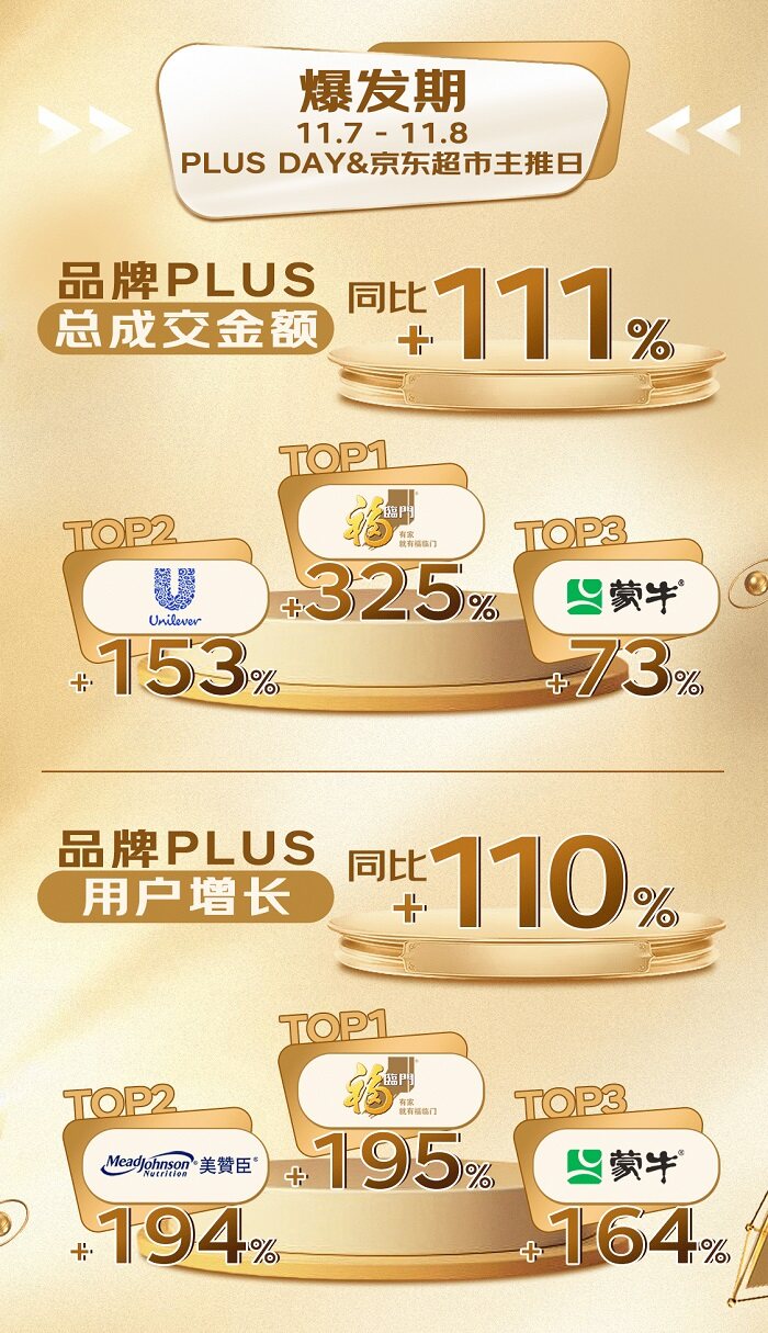 双十一期间,京东PLUSDAY与京东超市同频爆发,从品牌权益投入、专属心智货品及平台资源加持三方面入手,实现品牌PLUS用户及成交额双增长。据战报显示,品牌PLUS总成交金额同比增长111%,品牌PLUS用户同比增长110%。其中特仑苏爆品订单量同比增长1113%,安达露西产品订单量同比增长394%,科罗娜产品订单量同比增长325%。