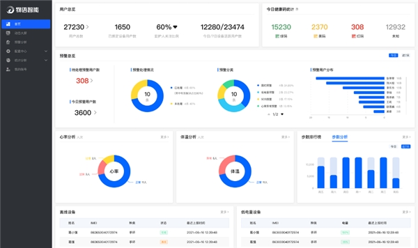 后台业务系统满足管理单位工作人员需求,可批量管理设备信息、用户信息,自定义报警方式,报警信息处理、事件进度监控,查看及统计数据报表等。