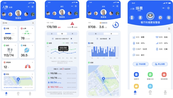 具体应用是在特定老年人家中预设走失找回、跌倒预警、突发疾病预警、日常健康情况监测、环境危险预警等场景,通过智能手表、睡眠监护仪、智能血压计、跌倒监测仪、烟雾报警器、燃气泄漏报警器等健康安全守护设备,收集老年人家庭生活场景中的各类行为、环境数据,并通过联合计算,分析并预警潜在隐患,及时作出安全处置。