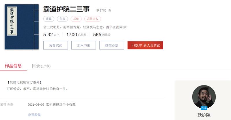 目前,《霸道护院二三事》正在起点读书APP和QQ阅读持续连载中,期待耿护院与他的小说能够持续为《赘婿》带来源源不断的衍生内容与玩法新意。