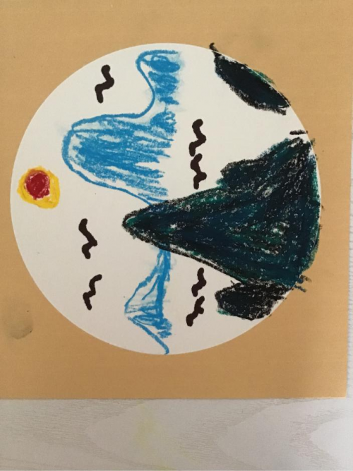 这个就到了绘画技巧的环节了,同样是画山,远处的大山和近处的大山迭代相错,加上颜色的变换,让孩子认识到了进深的关系。期间,每一步老师都会讲解地很细致,整幅画虽然寥寥几笔,但是仔细一看层次感的氛围一下子烘托出来了,加上老师的夸奖和鼓励让小宝也非常有成就感。