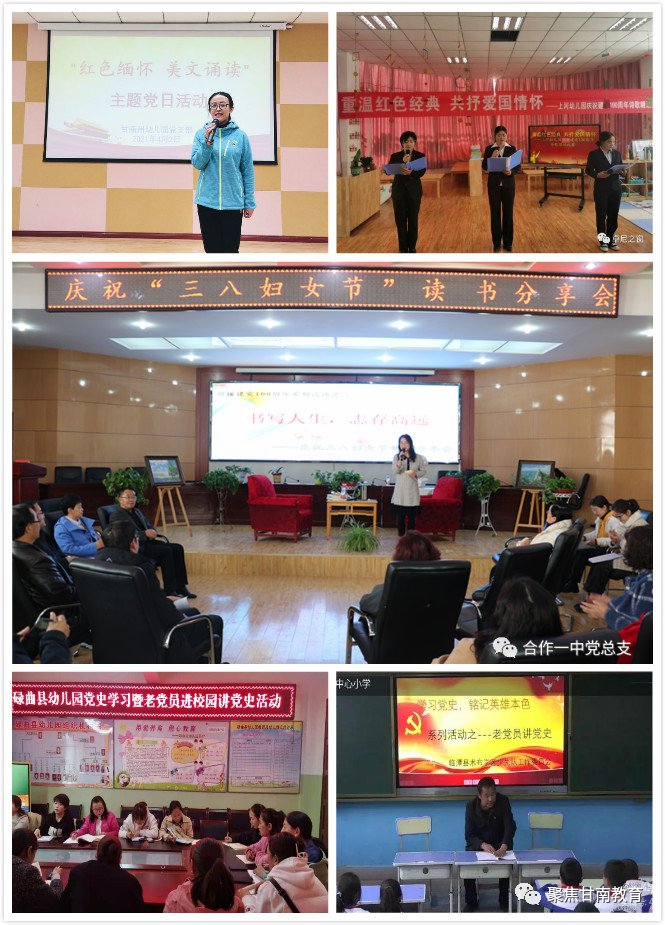 甘南州幼儿园、卓尼县上河幼儿园以组织生活为抓手组织开展了“美文诵读、诗歌朗诵”主题党日活动。老师们用激昂的文字,声情并茂地朗诵红色经典美文,缅怀革命先烈,讴歌党的丰功伟绩,诠释了爱国情怀。合作一中为营造良好的读书氛围,增强教师文化底蕴,组织开展了“书写人生,志存高远”—庆祝“三八”妇女节读书分享会,让广大师生在读书活动中沐浴文化的恩泽,享受阅读的快乐,树立文化自信。临潭县术布中心小学、碌曲县幼儿园邀请老党员为学校师生开展老党员讲党史活动。邀请老党员用通俗易懂的话语,为师生们讲解了中国共产党100年的奋斗史,让少年儿童了解了中国共产党走过100周年的光辉历史,让他们从小知道,今天的幸福生活都是革命先烈用鲜血和血汗换来的,进一步培养了他们的爱党、爱国情怀。