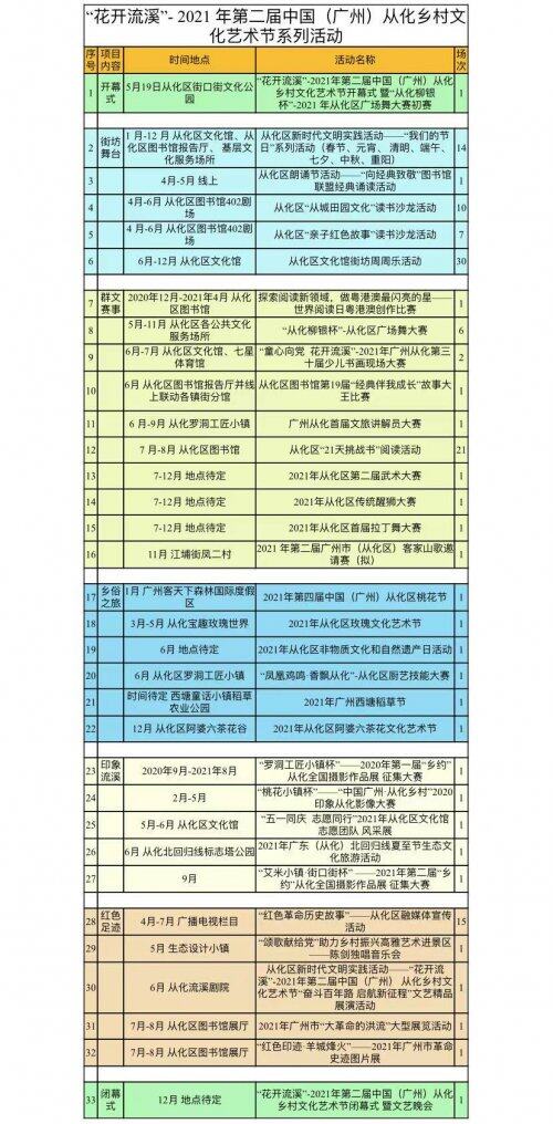 具体活动包括有:全国性活动“桃花小镇杯”—“中国广州·从化乡村”印象从化影像大赛、罗洞工匠小镇杯“乡约”从化全国摄影作品展征集活动(由中国摄影报社作为主办单位);广州市文旅部门支持的“大革命的洪流”大型展览活动、“红色印迹 羊城烽火”—广州革命史迹图片展等活动;6月举办的“奋斗百年路 启航新征程”文艺精品展演,该展演由10所驻从化高校积极参与、以10多个不同序篇呈现。丰富多彩的文体活动满足不同群体的多元化需求。