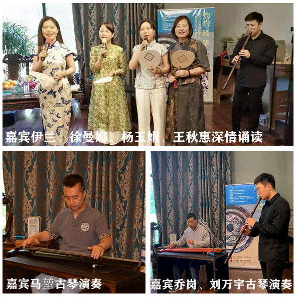 王秋惠谈了铜镜的文化内涵以及铜镜拓片的艺术价值。专家们从不同角度,对铜镜的收藏与鉴赏、镜铭书法、铜镜与中国画的关系、与女性的关系、铜镜的文化内涵等方面发表见解,视角独特,论证专业性强,吸引了在座诸位研究铜镜文化与拓片题跋艺术的兴趣,将本次活动推向高潮。历代诗人不乏写铜镜的诗文,白居易、杜牧等诗歌家喻户晓,广为流传。著名朗诵艺术家张全声情并茂,再现了李白《将进酒》的豪情。伊兰平日拓镜的同时常朗诵铜镜诗词,品鉴会上,伊兰将博物馆珍藏的草书镜上的秦观词用优美的声音表现得淋漓尽致,徐曼娜、王秋惠、杨玉娟着仿古服饰,执拓片与诗词书法一体的团扇深情诵读。马堃、乔岗、刘万宇的古琴、尺八、箫演奏使得品鉴会韵味十足。