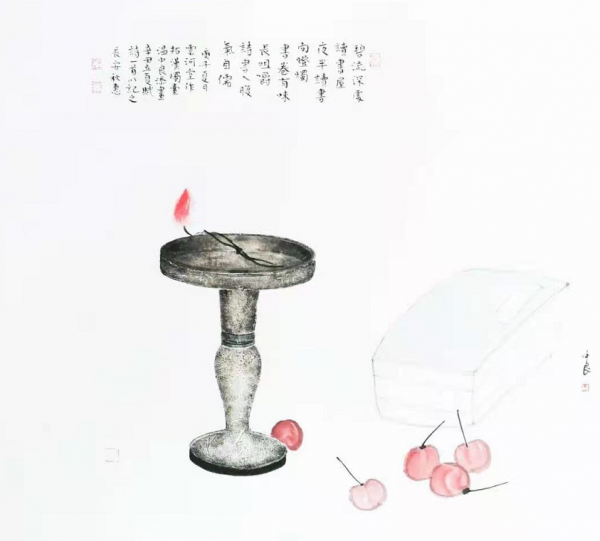 石瑞芳用“鸟语铜盘上,人思玉宇中”诗句形象概括了日本江户时期千鸟铭文镜展现的勃勃生机;徐曼娜的题贺作品对铜镜文化诠释精准;王江用“惟有花颜在,鲜妍花昔时”写自己对镜中花开花谢的感悟;岳峰的题贺作品对铜镜文化描述准确,书法精湛,与拓片浑然一体;倪文东教授的题跋书法舒美雅致;邓益民教授的唐仕女生动传神,和唐代铜镜一样雍容华贵;王秋惠用“我有好爵,君赠秬鬯。郁香黑黍,陈年佳酿。月下独酌,三爵不醉。花前吟诗,心影相随”题跋爵全形拓(秬鬯为商周时期用郁金香和黑黍酿制的酒),并配郁金香和黑黍画作,让沉睡几千年的爵有了生命感。刘勇对铜镜纹饰铭文精心研读,题跋作品章法设计独特。
