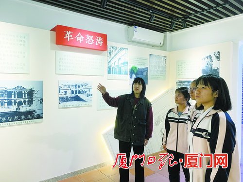 在中共闽粤赣边区厦门市委机关旧址使命馆的展厅,学生们聆听党史讲解,看历史图片。(庄伟超 摄)