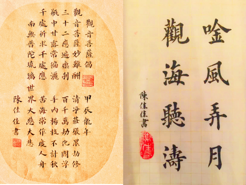 出身“书香门第”世家的陈佳佳,在家学方面具有优越环境。从5岁开始,陈佳佳得到了著名书法家姚俊卿的传统家教指导,9 岁进入了中国书画函授大学系统性研习“行楷隶篆”, 11 岁颜体楷书在日本被印刷为“中日友好交流”的挂历, 书法为她的高度自律精神打下了深厚的基础, 更塑造了她的传统文人气质, 飘若浮云,矫若惊龙,一点傲气在里面,不媚不俗。