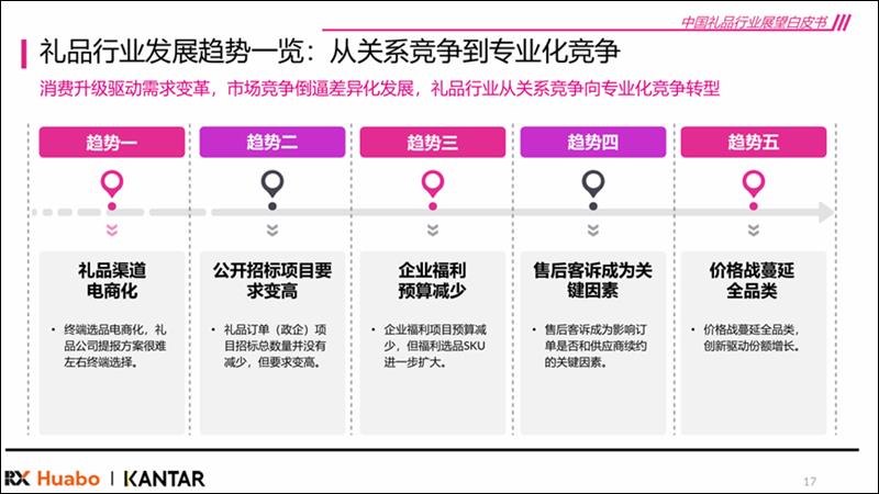 行业竞争正从依赖资源关系向专业化、数字化、服务化转型,具体表现为五大趋势:一是礼品渠道电商化,政策推动与企业采购线上化,价格透明度提高,传统礼品公司影响力减弱;二是政企招标要求提升,强调合规、透明与数字化服务能力;三是福利预算减少但SKU扩大,企业通过扩展品类、弹性福利与积分制提升员工体验;四是售后客诉成为续约关键,物流、定制、响应速度等服务能力直接影响合作稳定性;五是价格战蔓延全品类,标品利润持续走低,唯有通过差异化创新驱动增长,如IP融合、场景化设计、情绪营销等模式,实现产品高溢价与快迭代。整体来看,行业进入“服务决胜+创新驱动”的新阶段。