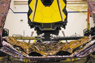 技术人员正在对韦伯太空望远镜的一个组件进行检查。图片来源:诺斯罗普·格鲁曼
