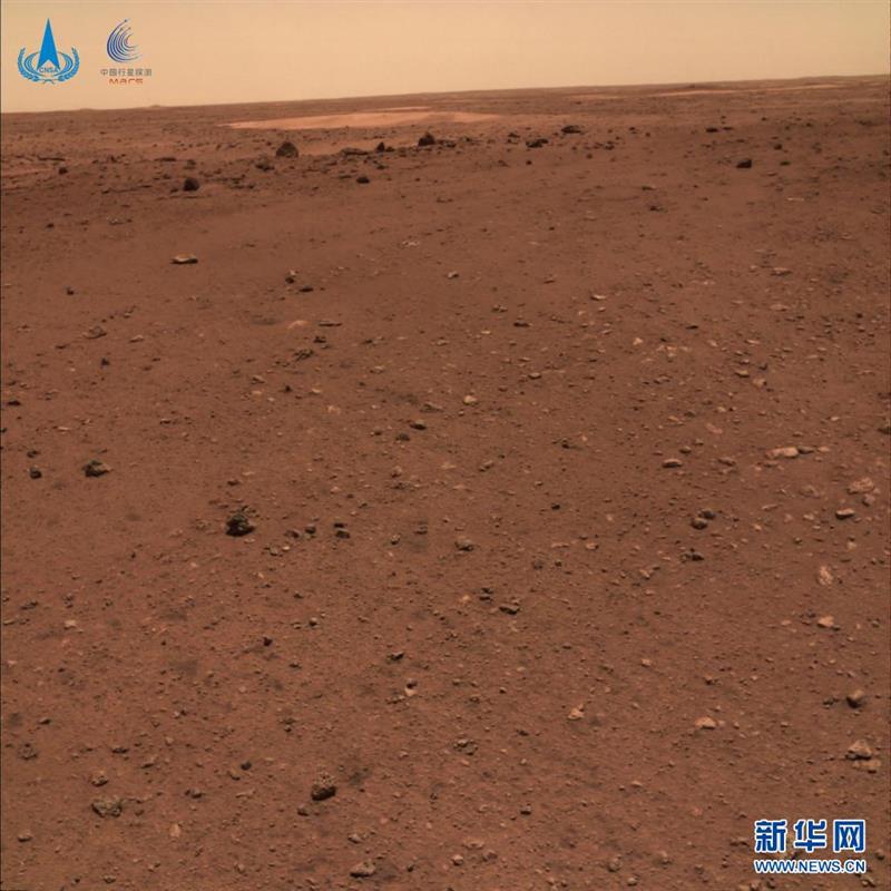 着陆点全景图,是火星车尚未驶离着陆平台时,由火星车桅杆上的导航地形相机,进行360°环拍,经过校正和镶嵌拼接而成。图像显示,着陆点附近地势平坦,远处可见火星地平线,石块丰度和尺寸与预期一致,表明着陆点自主选择和悬停避障实施效果良好。
