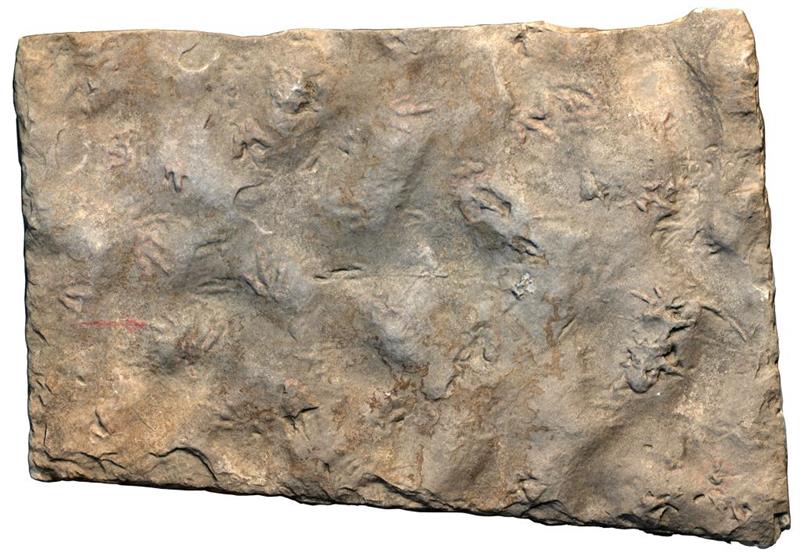 古生物学家认为,同一块岩板上连同这个足迹一起被发现的40多个三趾型足迹都属于跷脚龙足迹类,跷脚龙足迹常见的尺寸小于15厘米。