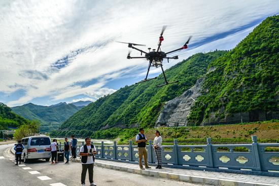 2020年6月23日,陕西省汉中市,无人机驾驶员操控多旋翼无人机——大疆经纬M600在略阳县境内的宝成铁路王家沱至乐素河区间K227+210m处起飞,借助北斗卫星导航系统,对Ⅰ级防洪点危岩山体进行视频和图片数据采集,为精细化构建无人机监管平台奠定基础。视觉中国供图