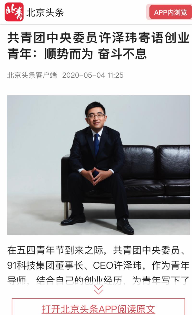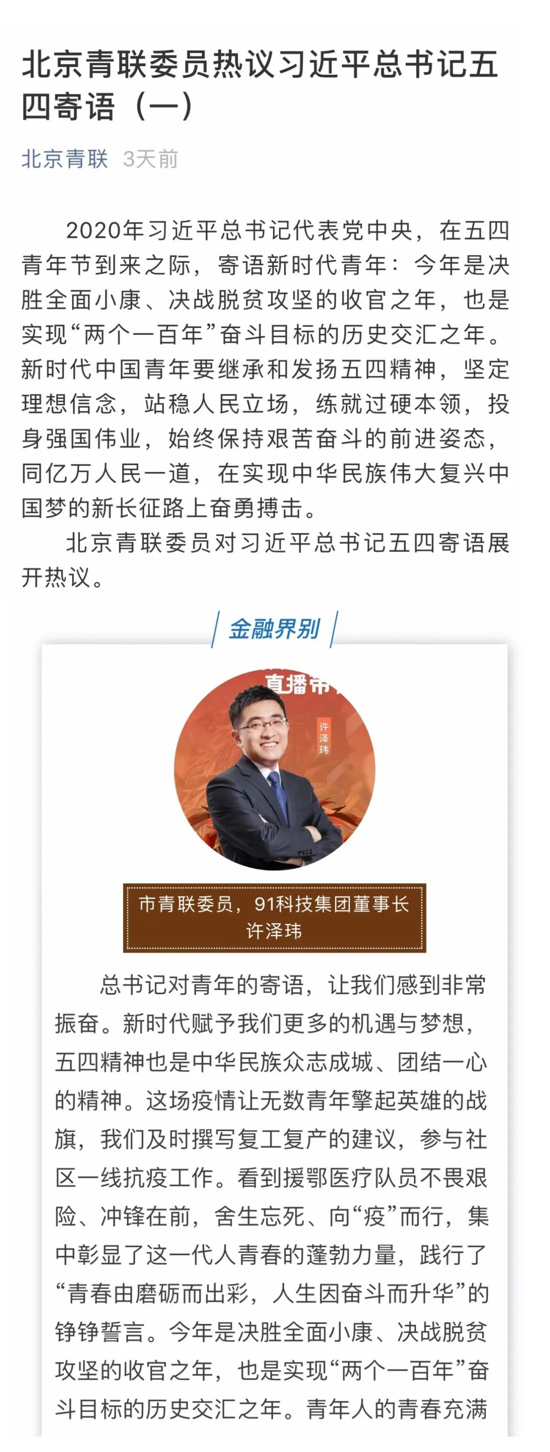 北京头条、北京青联报道91科技集团许泽玮:牢记总书记对新时代青年寄语 成为堪当大任的新时代青年