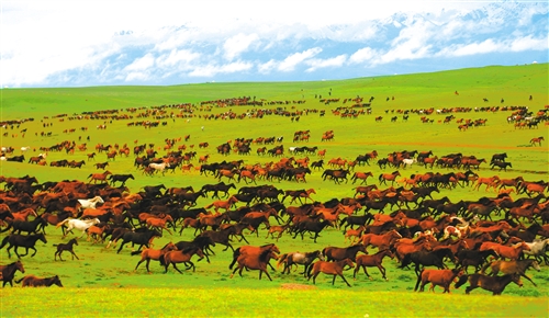 ▼新疆昭苏县昭苏镇牧民正在草原上放牧。近年来,昭苏围绕“天马”特色资源,打造新疆最大的马文化及草原生态旅游胜地,推动经济社会发展,促进农牧民增收。 李文武摄