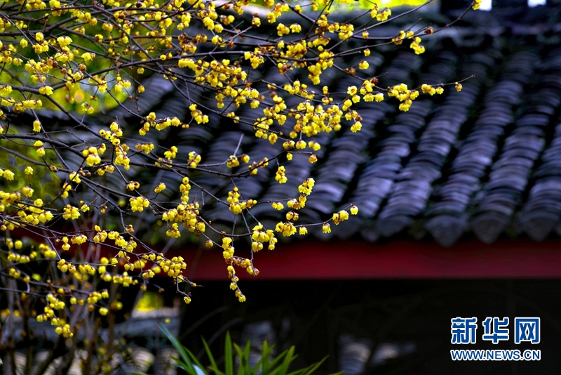 青瓦映衬下的蜡梅花。