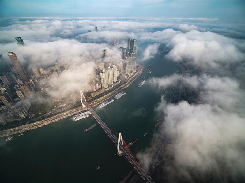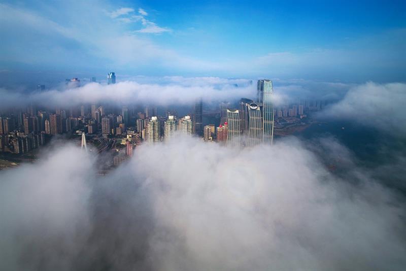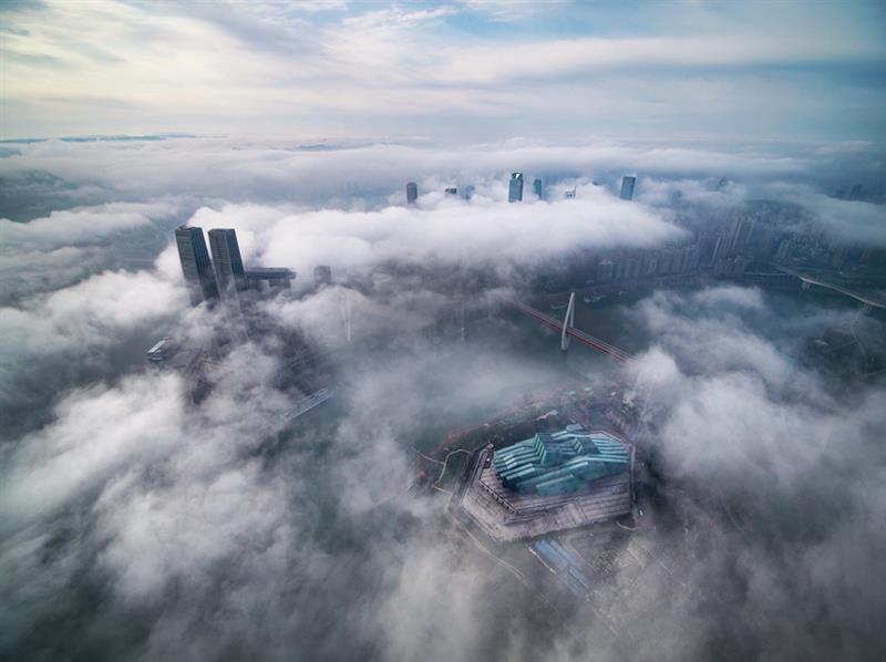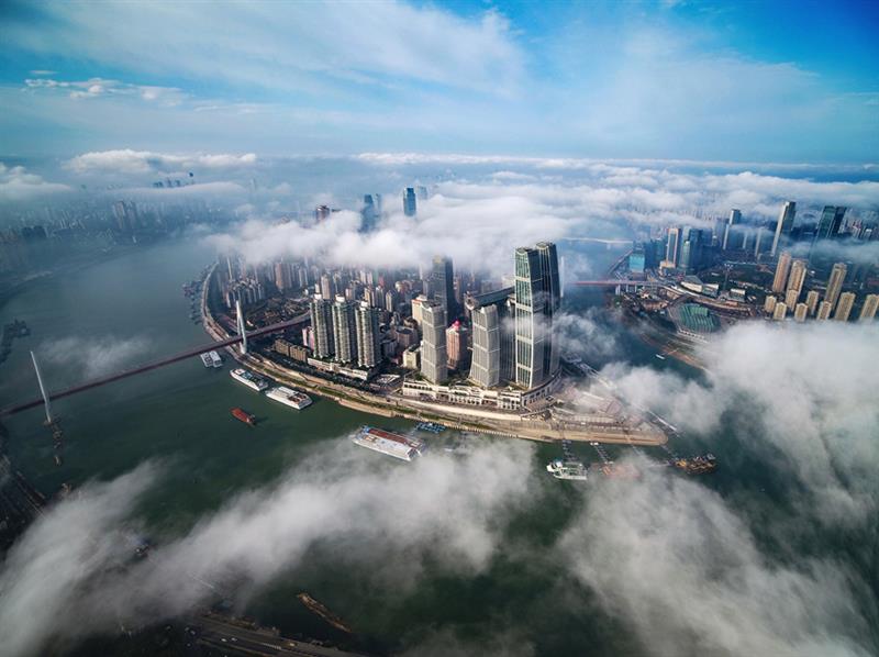 航拍重庆城区,云雾缭绕宛如仙境。王正坤摄