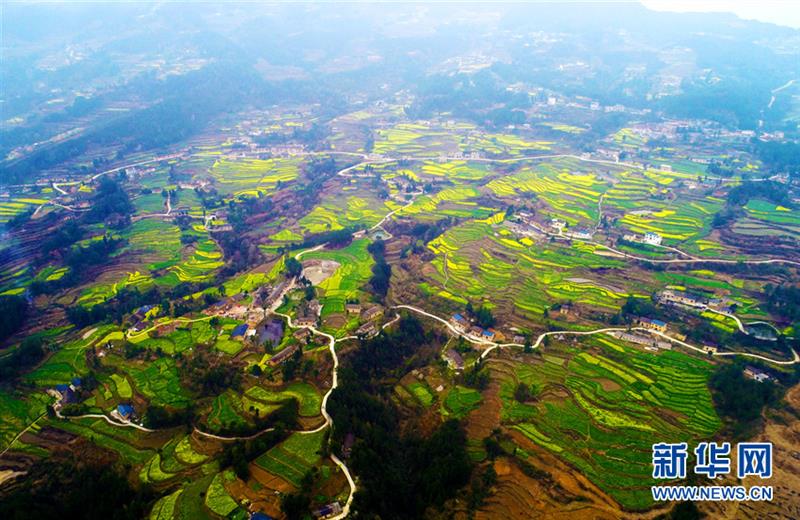 湖北省巴东县东瀼口镇牛洞坪村,油菜花像地毯一样布满田野,成为大山里一道亮丽的风景线。焦国斌 摄