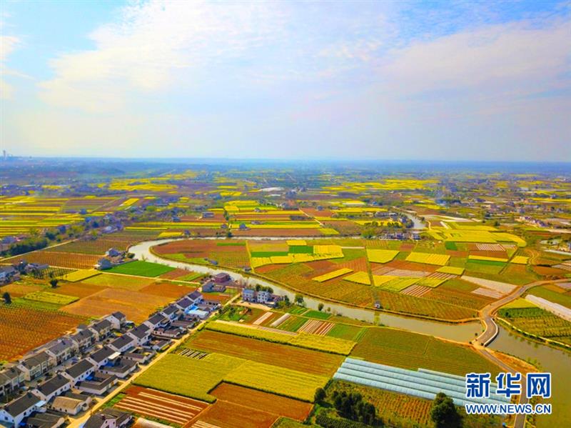湖北省枝江市董市镇近万亩油菜花开放,将村庄装点成金色的海洋。陈黄奎 摄